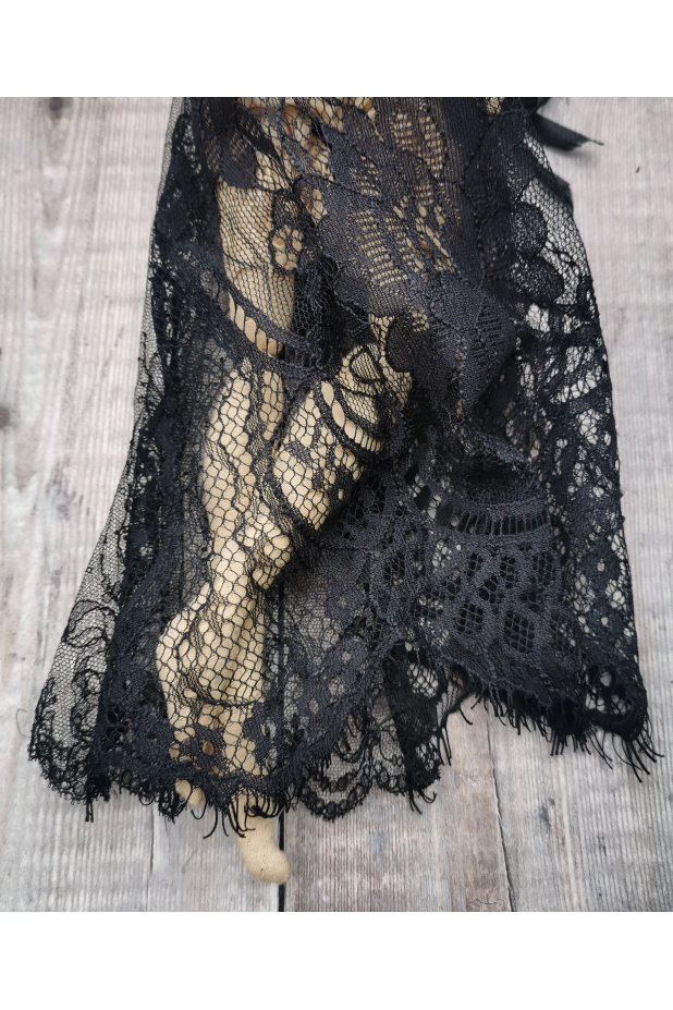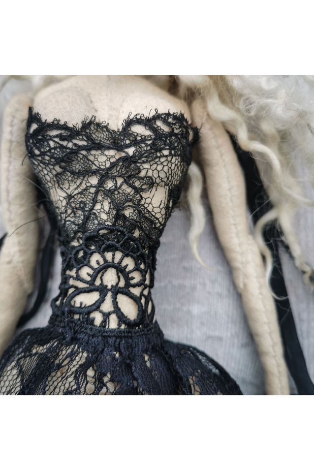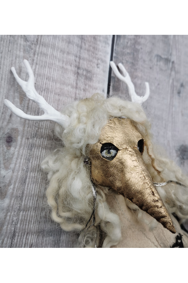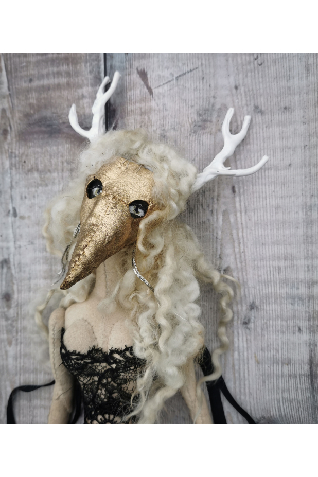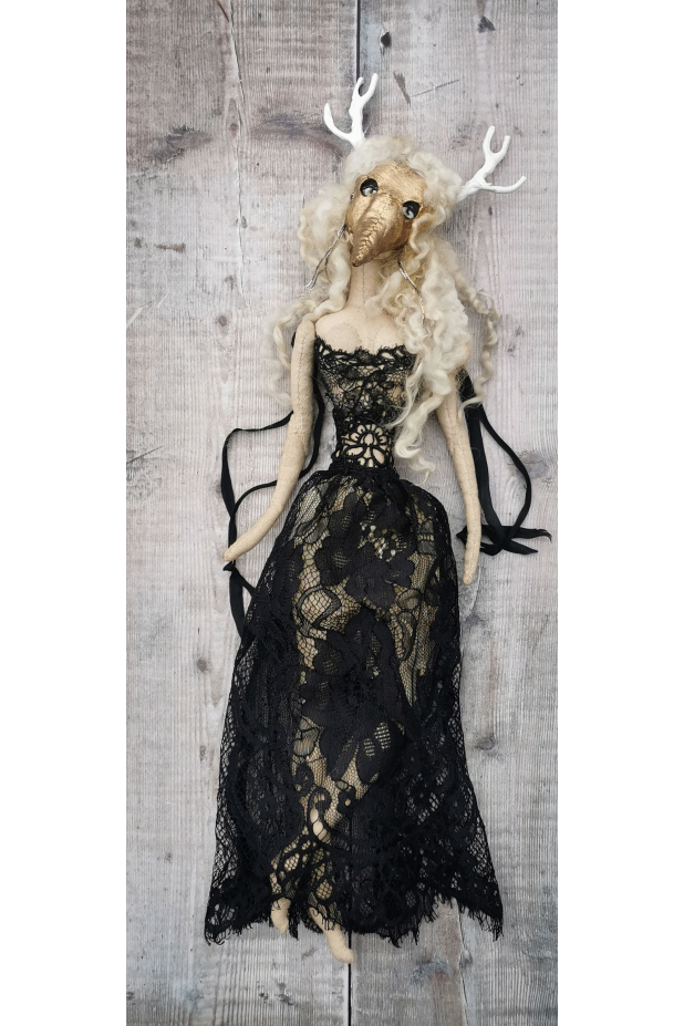 Standing a shade over 18" (46cm) tall from the tips of her toes to the top of her antlers, she wears a dress of vintage black lace over silk and lace bloomers. Her mask is leather, her hair Teeswater wool, and her organic cotton body is filled with lambswool - all natural, all recyclable.