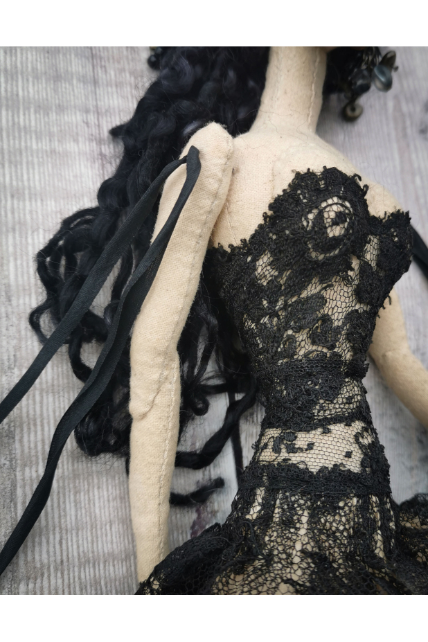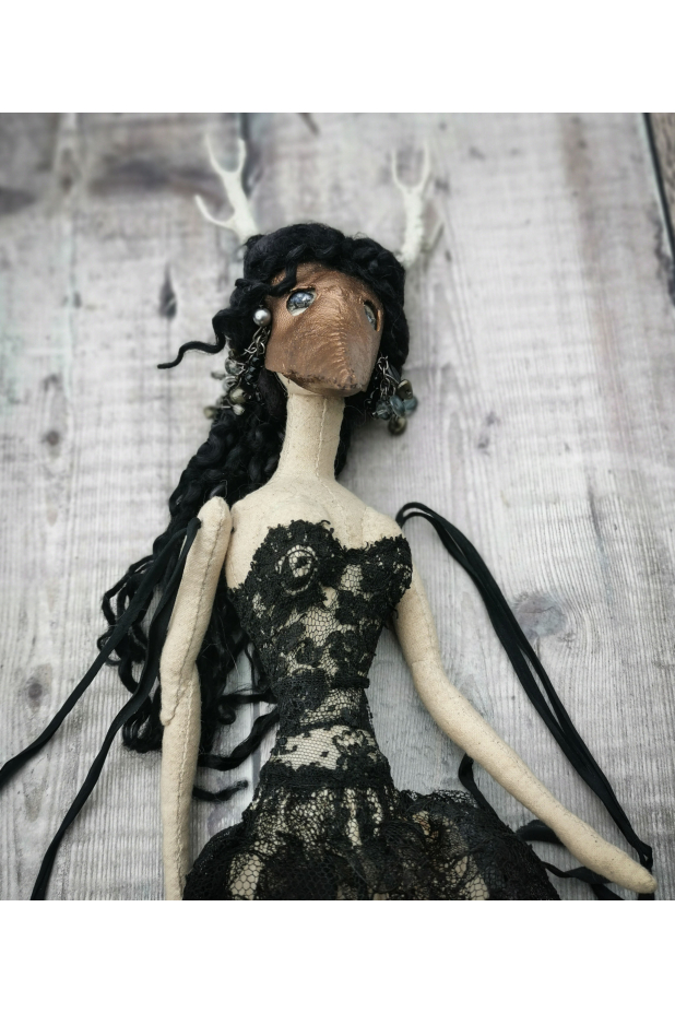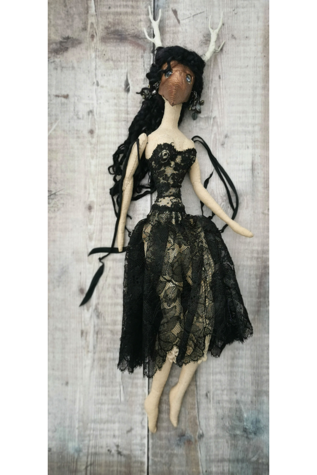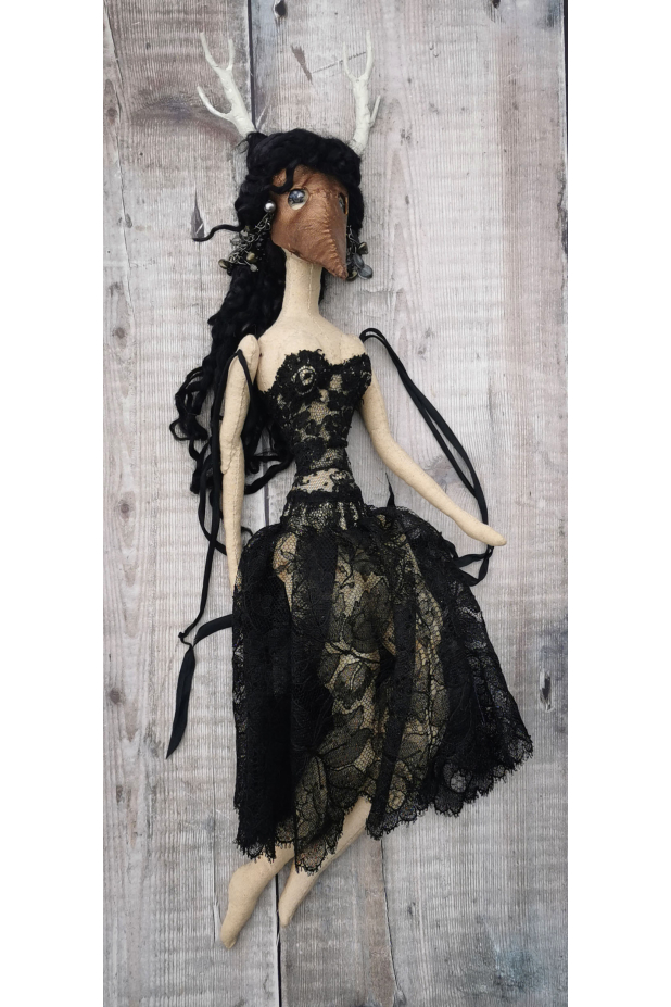 She stands a shade over 18" (46cm) tall from the tips of those twitchy toes to the top of her antlers, and wears a dress of vintage black lace over silk and lace bloomers. Her mask is leather, her hair Teeswater wool, and her organic cotton body is filled with lambswool - all natural, all recyclable.