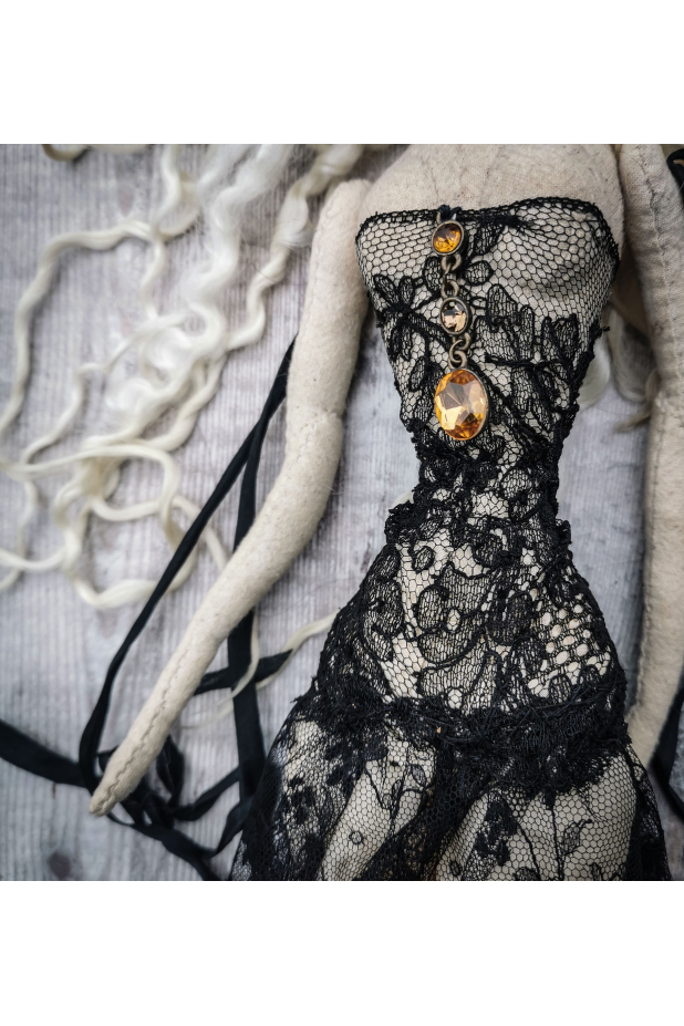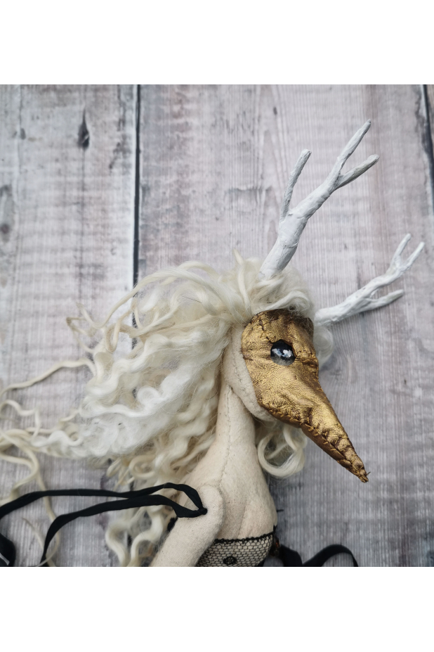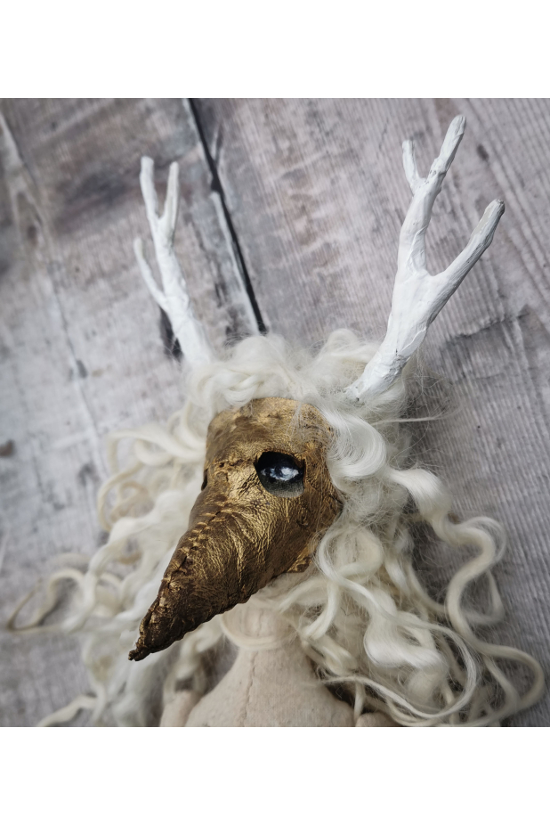 Standing a shade over 18" (46cm) tall from the tips of her toes to the top of her antlers, she wears a dress of vintage black lace over silk and lace bloomers. Her mask is leather, her hair Teeswater wool, and her organic cotton body is filled with lambswool - all natural, all recyclable. Her bodice is adorned with a small vintage pendant.
